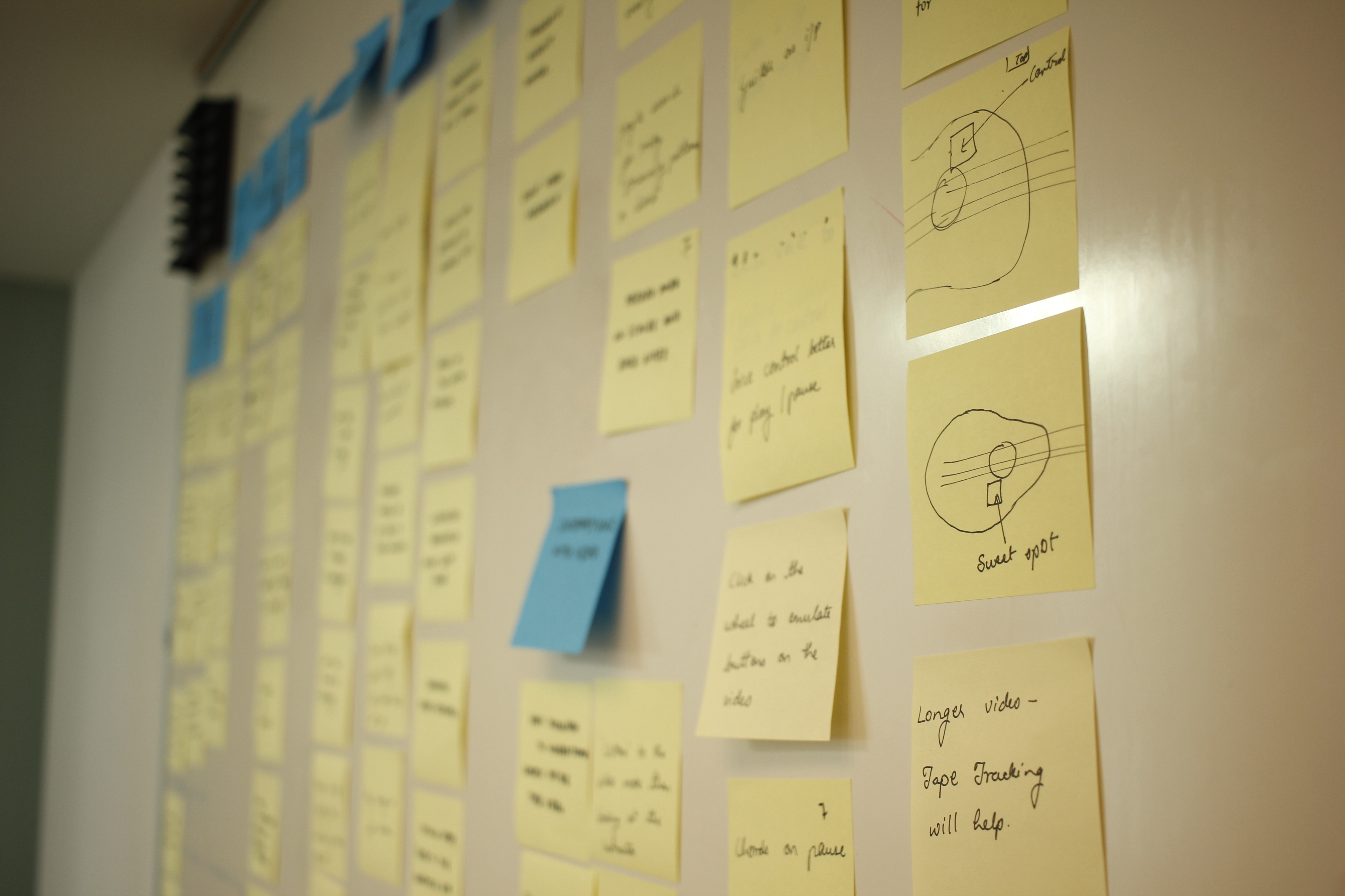 We knew the most effective solution would be something that resonated best with our users. So, we turned to them for guiding us forward. Our procedure was simple. We asked the participants to learn a song they did not know from YouTube using a device of their choice with a guitar in their hand. We then took a bunch of stickies and drew controls on the fly as the participants wanted.