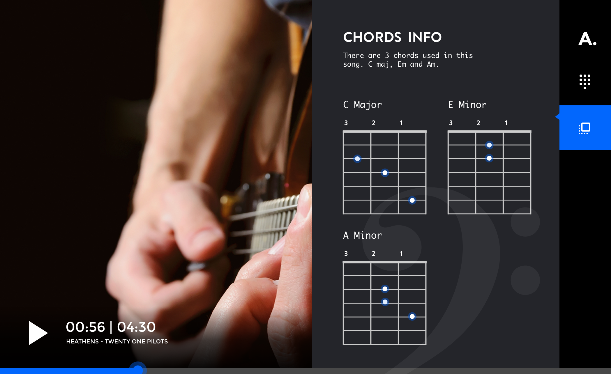 Every guitar tutorial is in a different format depending on the content creator. With Aria, we put the learner in control of the information they want to see at any given point. Information like chords, strumming, scales, etc. can be swiped on and off the screen as required. The predictability of finding information at the same place every time also makes the application easy to use especially when the user is concentrating on learning a song.