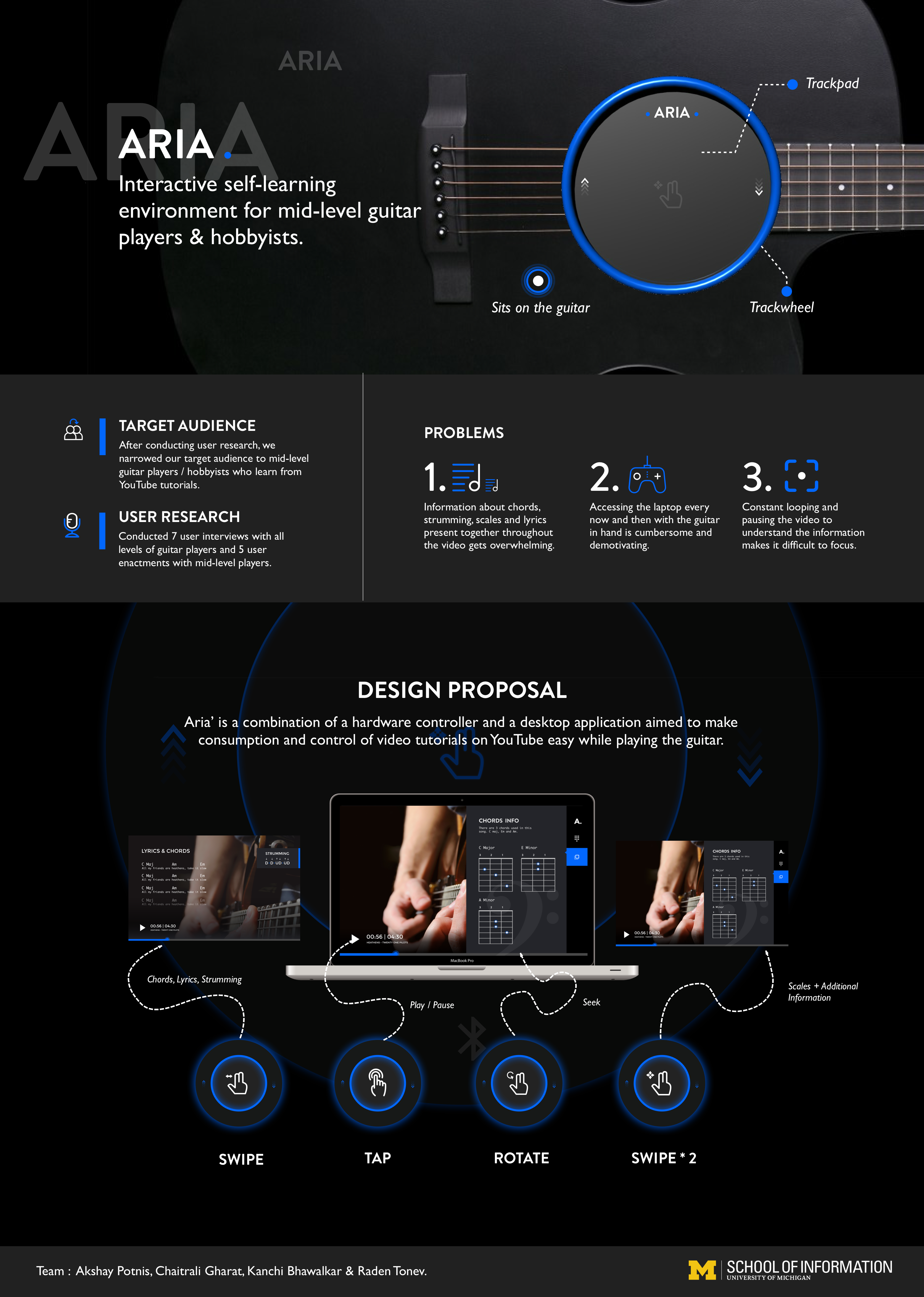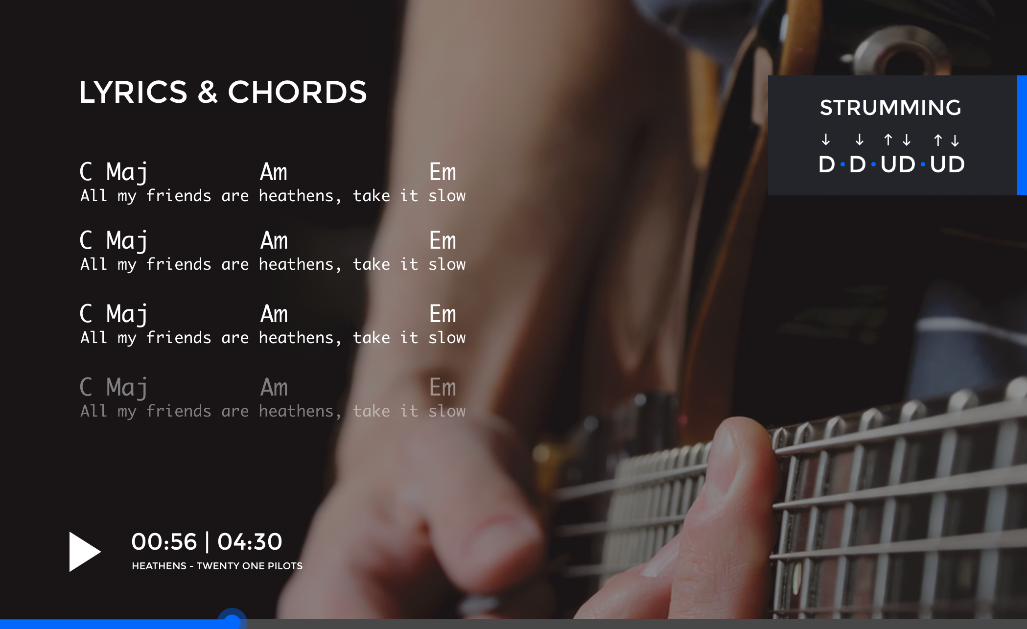We designed the interactions to make the most used functions - play, pause and seek extremely easy.Single swipe brings in information which supports learning while the video plays e.g. chords, lyrics and strumming Secondary information like finger positions for chords and all lyrics of a song is shown on a second swipe. This also pauses the video so that a mid-level learner can learn how play a particularly complex chord without missing out on the lesson or getting distracted.