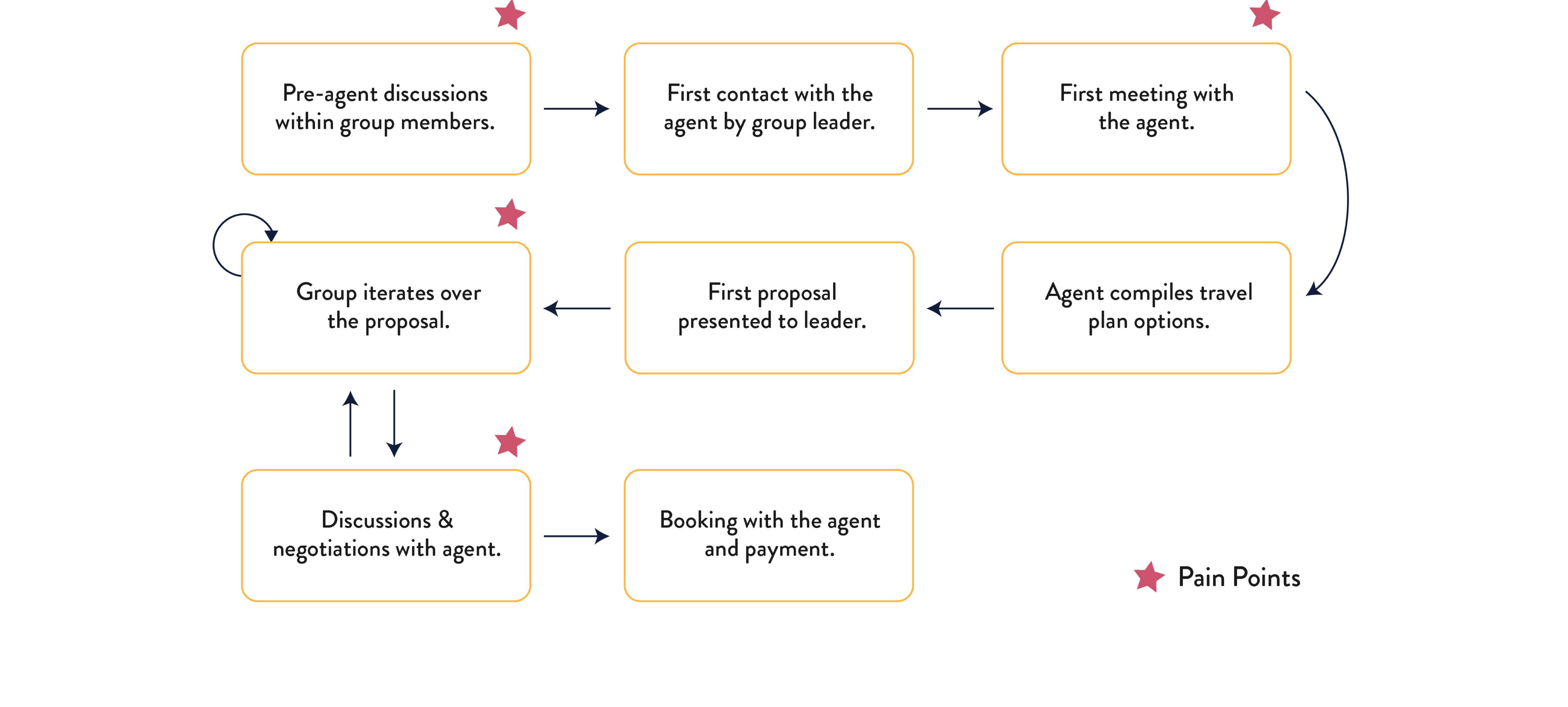 We created a workflow for the group planning process and identified pain points causing breakdown in the process.We found that the biggest bottleneck in this process was communicating interests and preferences of individual group members to the travel agent. This was a critical part of the process that consumed the maximum amount of time and energy, and most customers would drop-out at this stage.